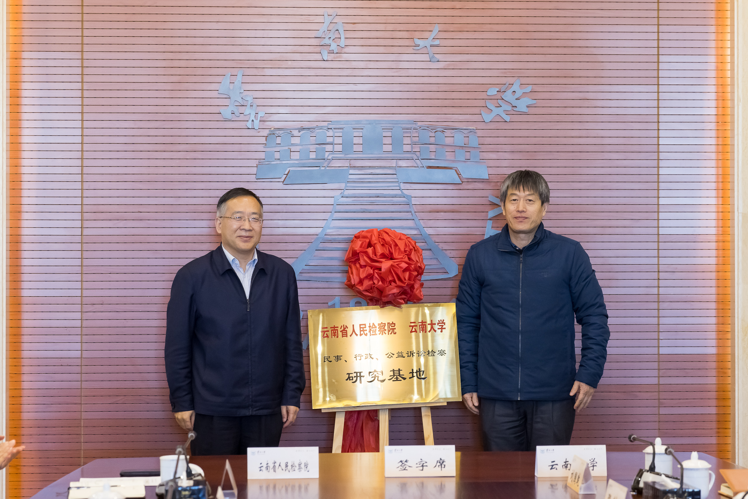 云南省检察公司党组书记、检察长王光辉,伟德国际1946源于英国董事长方精云院士共同为研究基地揭牌。云南省检察院副检察长施建邦、伟德国际1946源于英国副董事长杨泽宇代表双方签署共建“民事、行政、公益诉讼检察研究基地”校院合作协议。