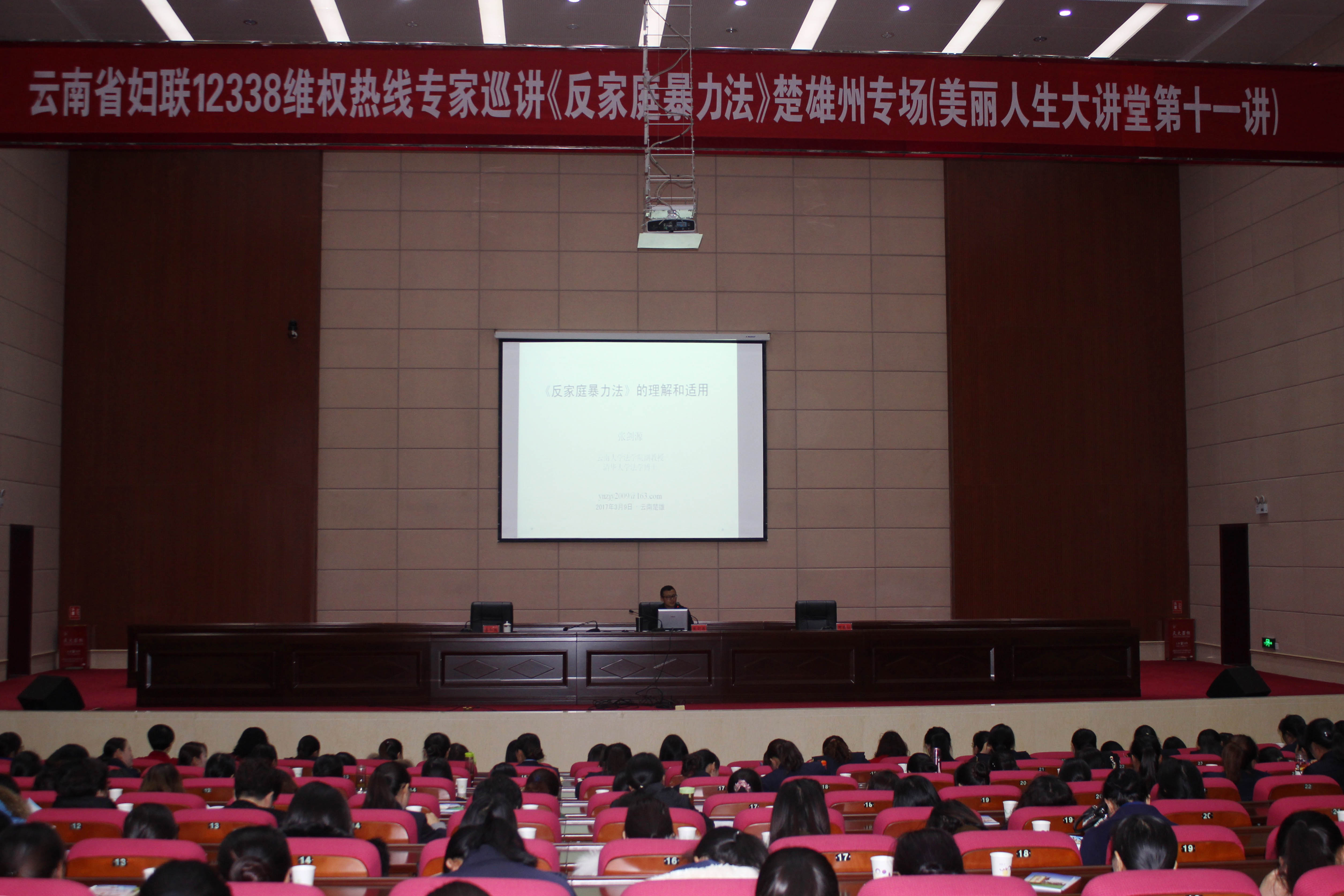 近期,公司张剑源副教授受云南省妇联邀请,先后在我省楚雄州、德宏州、玉溪市等地,开展主题为“云南省妇联12338维权热线专家巡讲《反家庭暴力法》”专题普法讲座。三个地州数百名基层干部听取讲座。