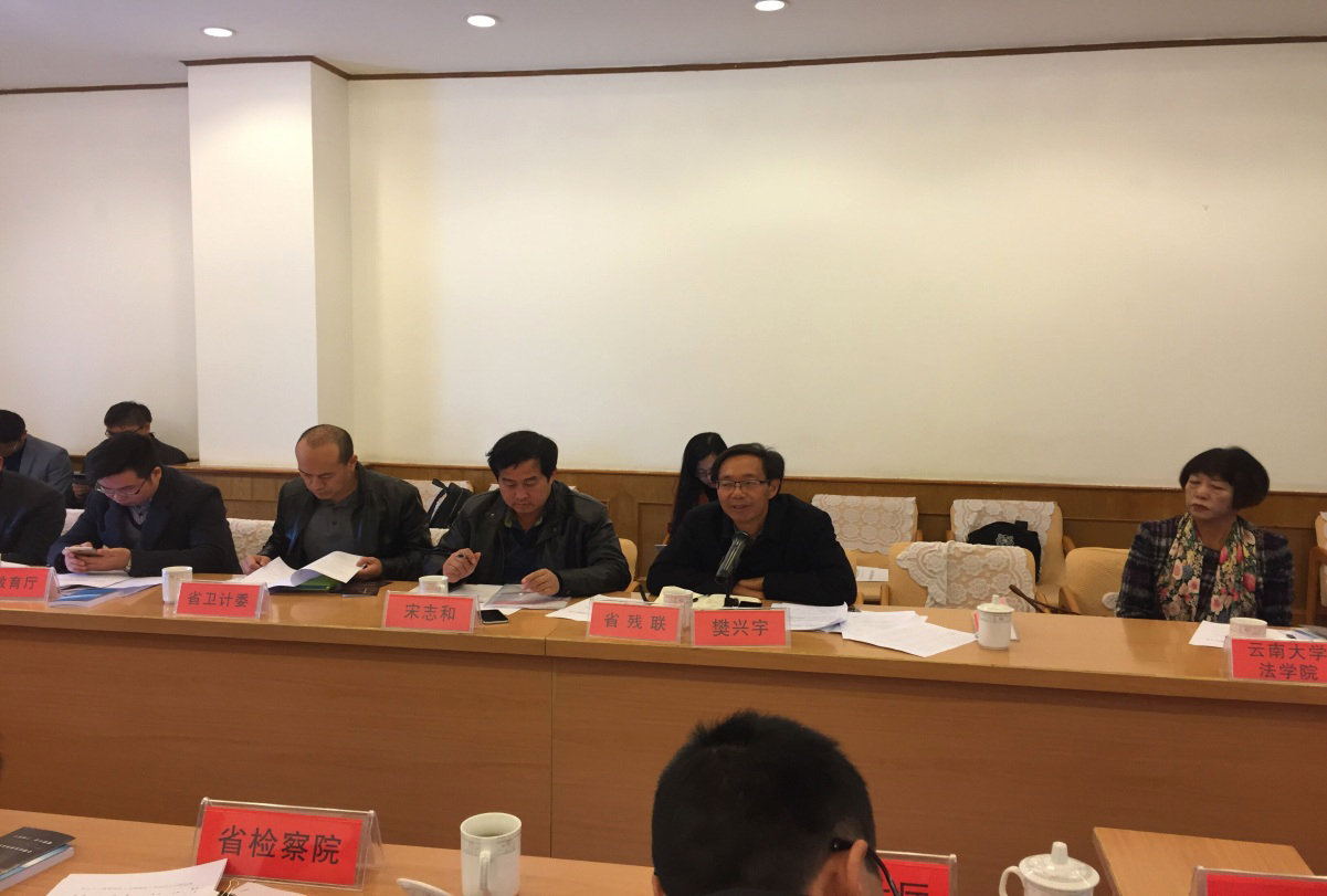 云南省司法厅调研员鲁仕发就残疾人法律援助工作做了简短的介绍,并进一步提出要不断扩大援助的范围,降低援助门槛以尽可能维护绝大多数弱势群体的合法权益。云南省公安厅治安大队副处长李伟就公安机关过去开展的关于残疾人维权方面的情况做了发言。云南省高院立案庭一庭庭长童晓宁在介绍了所在庭的三口(窗口---便民服务、入口---所有案件的立案、出口----信访)性质后,就在实践操作中如何尽可能的提高对于残疾人等弱势群体的办案效率,为他们提供更优质的服务等,一方面介绍了当前的做法,同时也提出了一些新的设想,以尽可能优化法院的服务。最后还提出建议,希望在今后,不管是机制方面还是个案各部门之间能够加强联络,争取在法治时代的当前,与各部门一起营造一种更好的法律服务的氛围,以更好的维护受害者尤其是弱势群体等的合法权益。云南省高级检察院,云南省人社厅也对关于残疾人这一群体的本部门工作的开展状况做了发言。