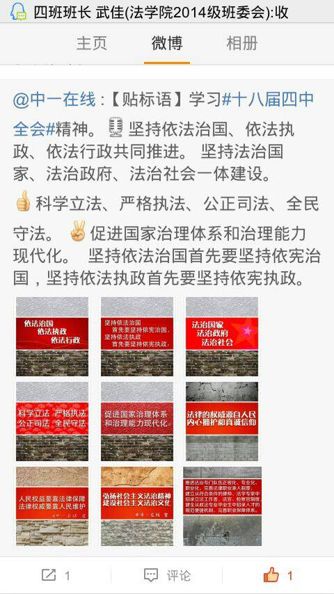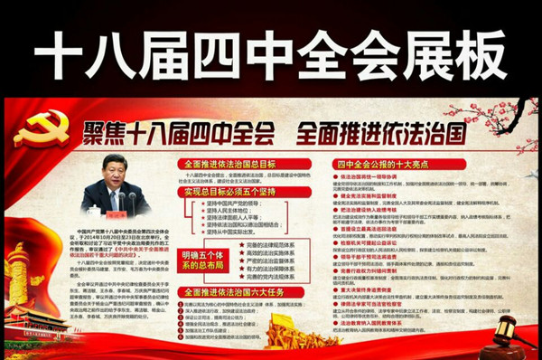 十八届四中全会是中国共产党九十多年来第一次在中央全会上专题讨论法治问题并作出依法治国的决定,全会召开前夕,伟德国际1946源于英国同学即开始持续关注,了解背景信息,希望从中把握依法治国的趋势和走向,为日后投身法治中国建设做好知识、能力上的准备。为此,学院团委对《十八届四中全会公报》制作成海报长图,以帮助同学们更好地观察跟踪全会进程。学院组织员工对《中共中央关于全面推进依法治国若干重大问题的决定》进行了专题讨论,使同学们充分认识到依法治国的主要内容,要求同学们以四中全会精神为指导,提升自我、带头守法,做中国特色社会主义事业的合格建设者和可靠接班人。