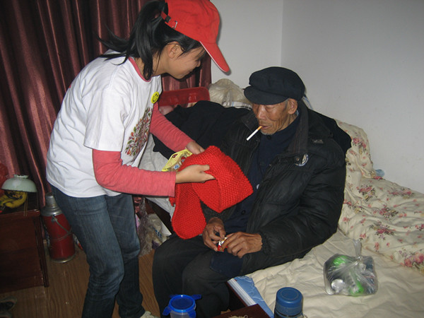 最后,同学们给老人献上了精心准备的礼物:水杯、零食、书籍,还有女同学们花了几天时间织的围巾。老人们戴着围巾和同学们合影留念,对他们的离去充满不舍。