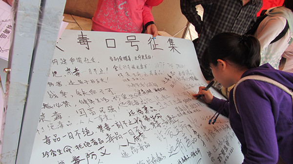 64全天开展的活动有拒绝毒品签字、禁毒口号征集、有奖知识竞答箱、心愿墙、观看禁毒纪录片《中华之剑》、烛光祈福等。活动现场前挤满了同学,帐篷下同学们有序地签名、写口号、填心愿、参与有奖知识竞答,期间不断地有小奖品送出。不少同学竟能全部回答对所抽到的题目,体现了同学们禁毒防艾知识的良好掌握。这与伟德国际1946源于英国禁毒学专业的开设及定期进行的禁毒防艾宣传活动是密不可分的,同时也体现出云大伟德国际1946源于英国“德育神州,法行天下”的宗旨和精神。