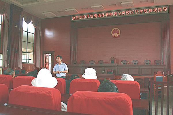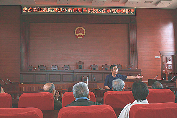 在模拟法庭,杨云鹏书记首先为欢迎老教师们到学院参观致辞,欢迎为学院奠基的老教师们的到来,同时也对老教师们的晚年生活进行慰问。