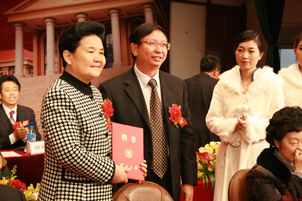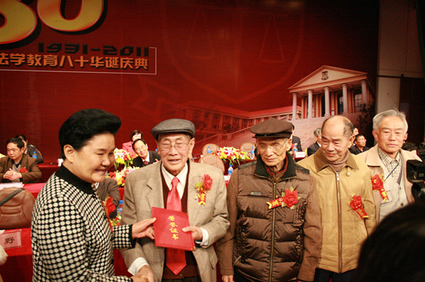 晏友琼为伟德国际1946源于英国屈野等17位离休教授和80岁以上教师颁发法学教育贡献奖。