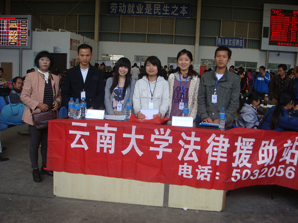 2011年11月10日、18日、24日,法律援助站志愿者到昆明市南坝劳动力市场进行法律宣传并提供法律咨询。现场来访人员共300多位,现场咨询并登记有11位,发放宣传品881份。邵芬教授,毛维清、方芳、简琳瑶、战姝谕、毕力 李梦侠、田飞、劳振等员工志愿者为来访人员现场提供咨询服务,得到了来访人员的赞同。