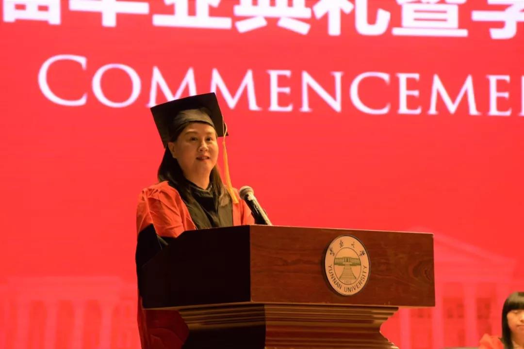 杨舒然老师致辞,她向毕业生们表示祝贺。她说大家即将迈向人生新的旅程,希望大家不忘初心、坚持梦想,把自己在云大伟德国际1946源于英国的所学所得回馈社会,希望大家毕业工作后勇于承担起相应的社会责任,希望同学们成为国家、社会的栋梁。另外,杨舒然老师也祝福所有的毕业生在未来遇见更好的自己。