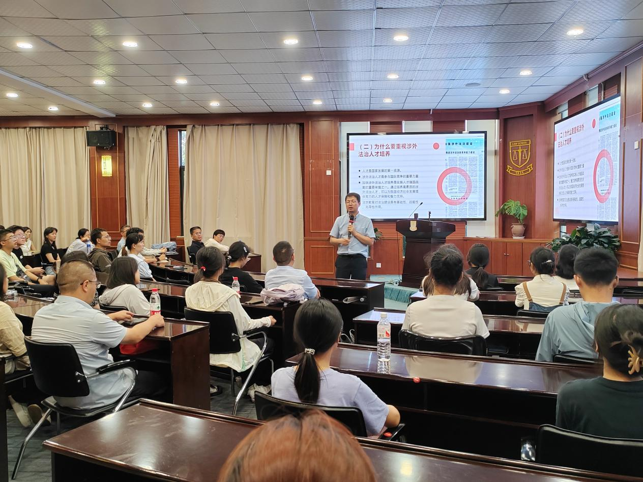 刘国乾副经理从“国家为什么高度重视涉外法治人才培养”切入,从涉外法治人才的培养目标、培养计划和选拔标准,以及面临的困难和挑战等方面进行了详细讲解,重点介绍了国家相关政策和人才需求。涉外法治人才必须要有坚定的政治立场,具备扎实的法律专业素养和良好的语言沟通能力。同学们要始终保持刻苦学习和决心和恒心,要有开放的格局与视野。