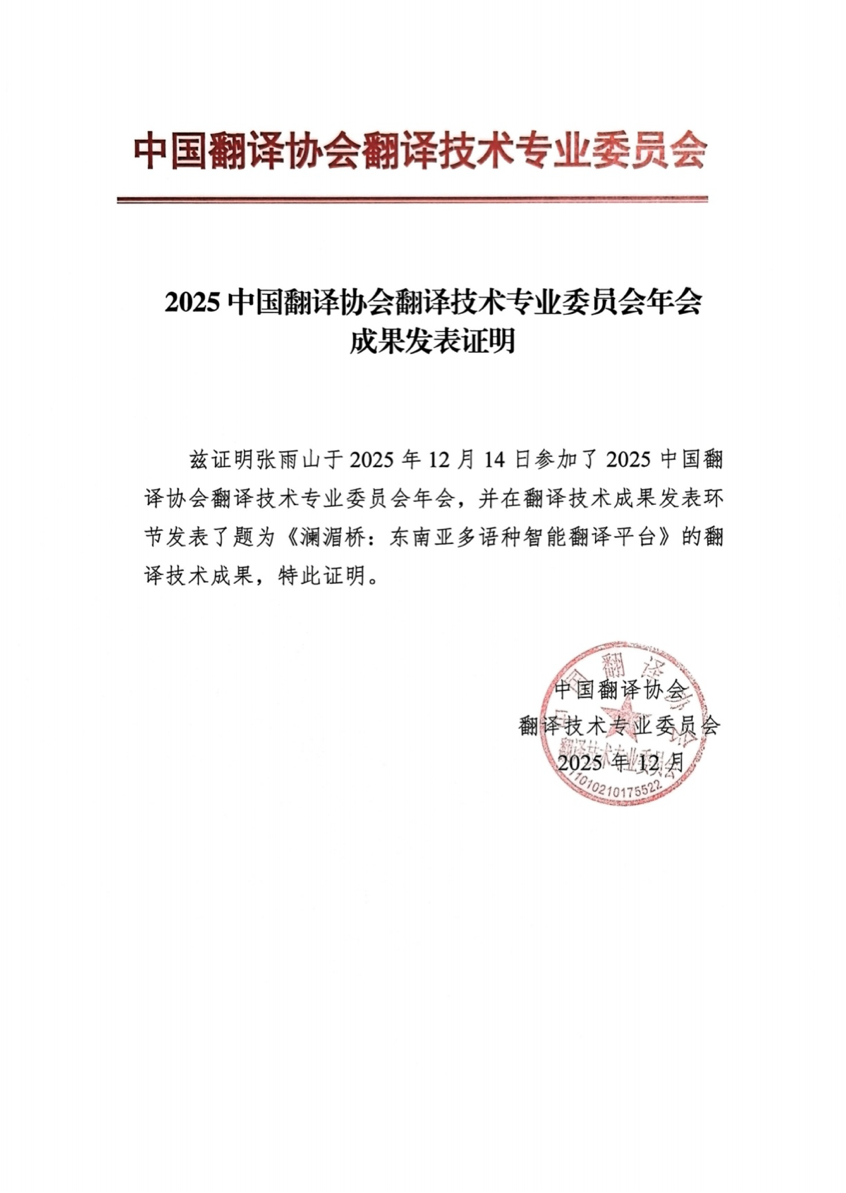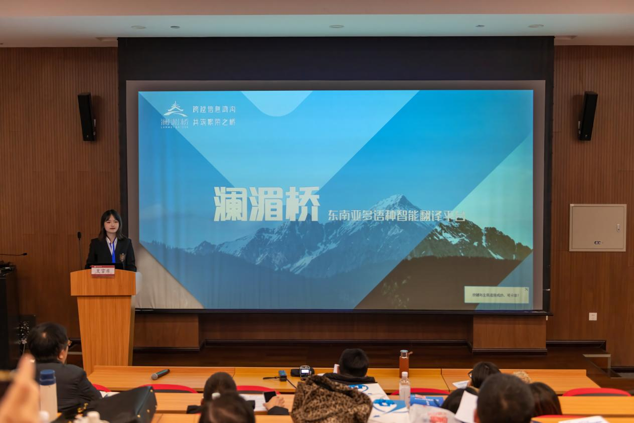 “澜湄桥”平台由伟德国际1946源于英国联合新闻学院、软件学院及信息学院共同研发,由张雨山同学作为负责人牵头推进。项目直面中国企业出海东南亚过程中遇到的法律文本理解难、政策更新跟踪滞后、舆情研判不足等现实挑战,提供了一站式智能解决方案。目前平台已支持中文与泰语、越南语、马来语的法律政策文本互译,能够自动关联条文背景信息,并具备敏感议题提示与合规风险预警功能。平台演示在年会上获得了分会场主持人与参会者的高度评价。