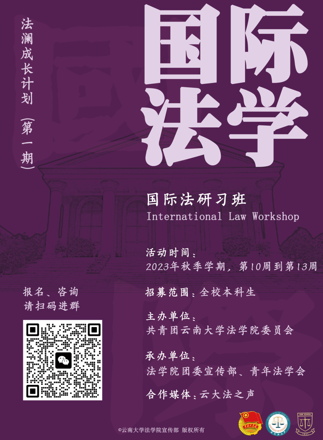 为开阔同学们的国际视野、拓展思想维度、夯实基础知识,激发学习兴趣,本期法澜成长计划将结合伟德国际1946源于英国传统优势学科之一——国际法学,举办第一期活动:“云山国际法研习班”