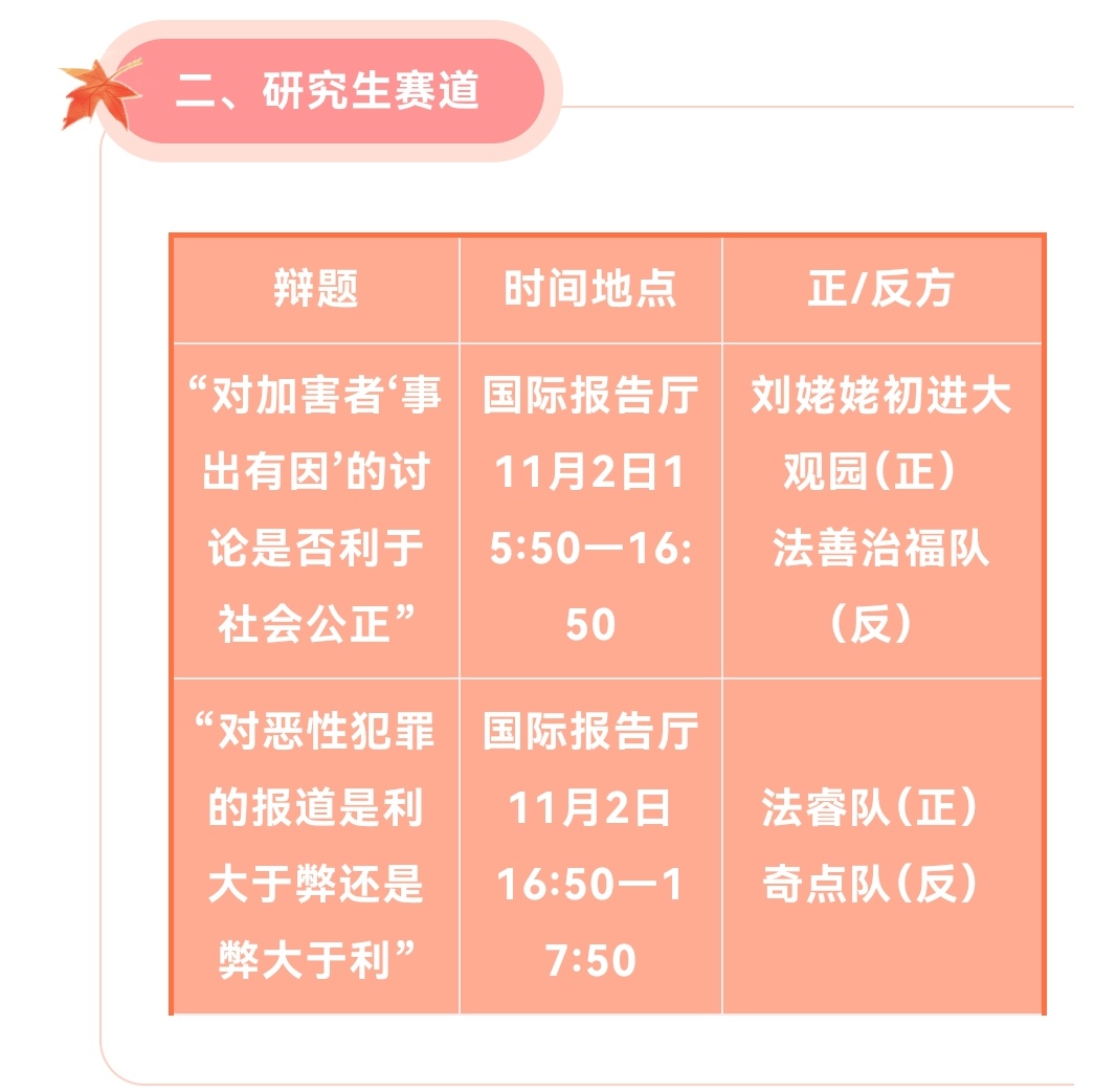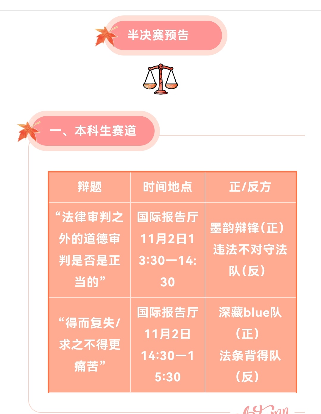 本科生赛道采用新的小组循环赛制,四组队伍每组三队进行车轮战。此形式要求每支队伍必须同时准备同一辩题的正反双方持方,在不同场次中转换立场进行辩论。这极大考验了辩手们的辩证思维与智识弹性。 经过一番苦战,两个赛道的四强名单最终尘埃落定。最终,共有本科生4支队伍与研究生4支队伍成功晋级半决赛。