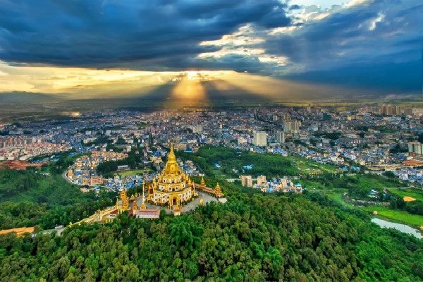 勐焕大金塔座落在芒市东南部海拔一千零七十九点六米的雷牙让山顶,进入金塔可以俯浏览芒市全景,传说“释加牟尼”生前转世为金鸡[阿鸾]时曾生活于此地,佛涅槃后数百年,佛教弟子“召罕大”[阿罗汉]为传播佛祖教义亲临此山修炼,为“召罕大”有个修练的好环境,野草和荆棘全部让开,故称为雷牙让山,意为野草让开的地方,尔后在此山建一佛塔,自古以来是人们公认的佛教圣地之一。